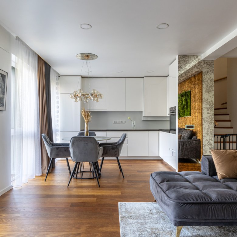Erdvi svetainė, virtuvės zona su valgomojo erdve (virtuvėje įmontuota visa reikalinga buitinė technika).