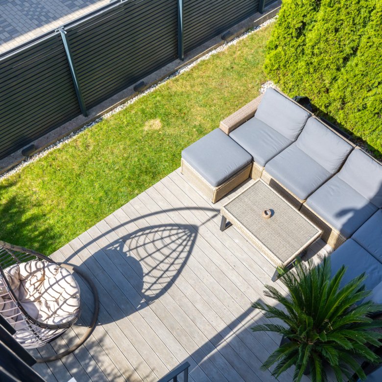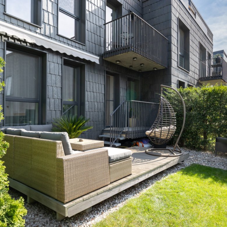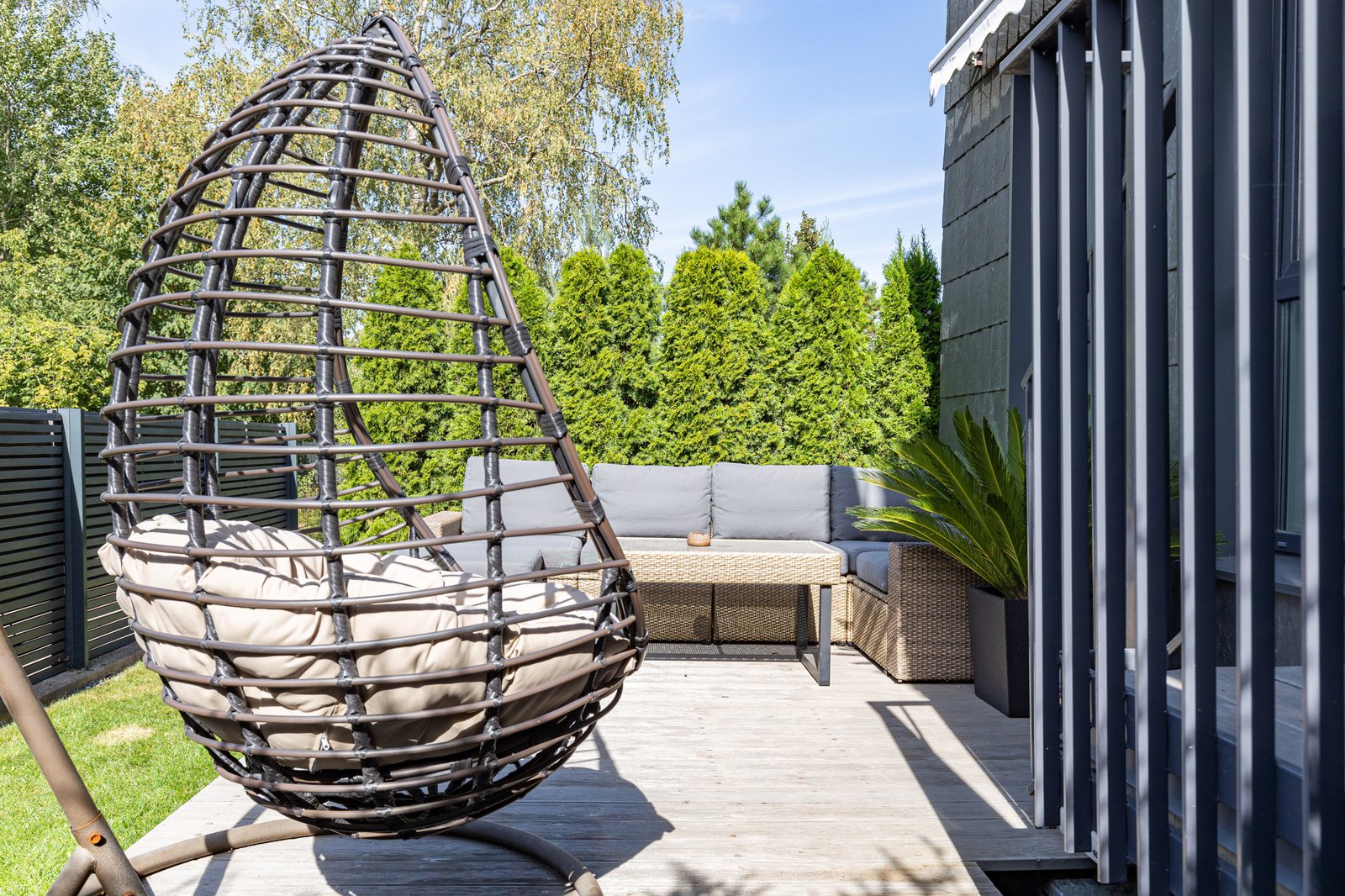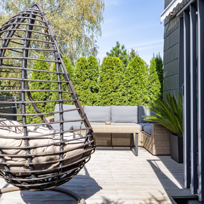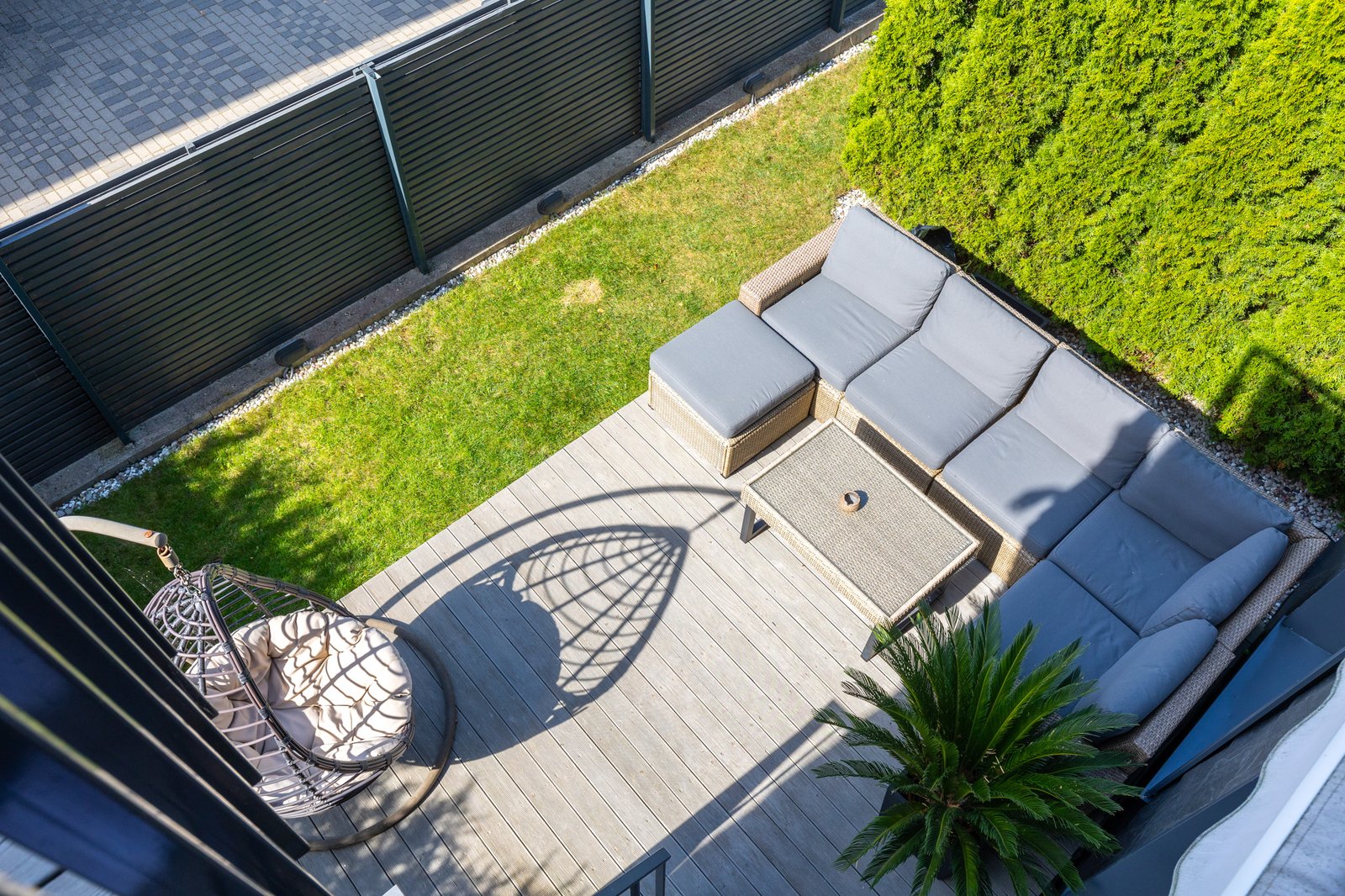 Iš svetainės – tiesioginis išėjimas į kampinę terasą su baldais, tvora ir tujomis, užtikrinančiomis privatumą.