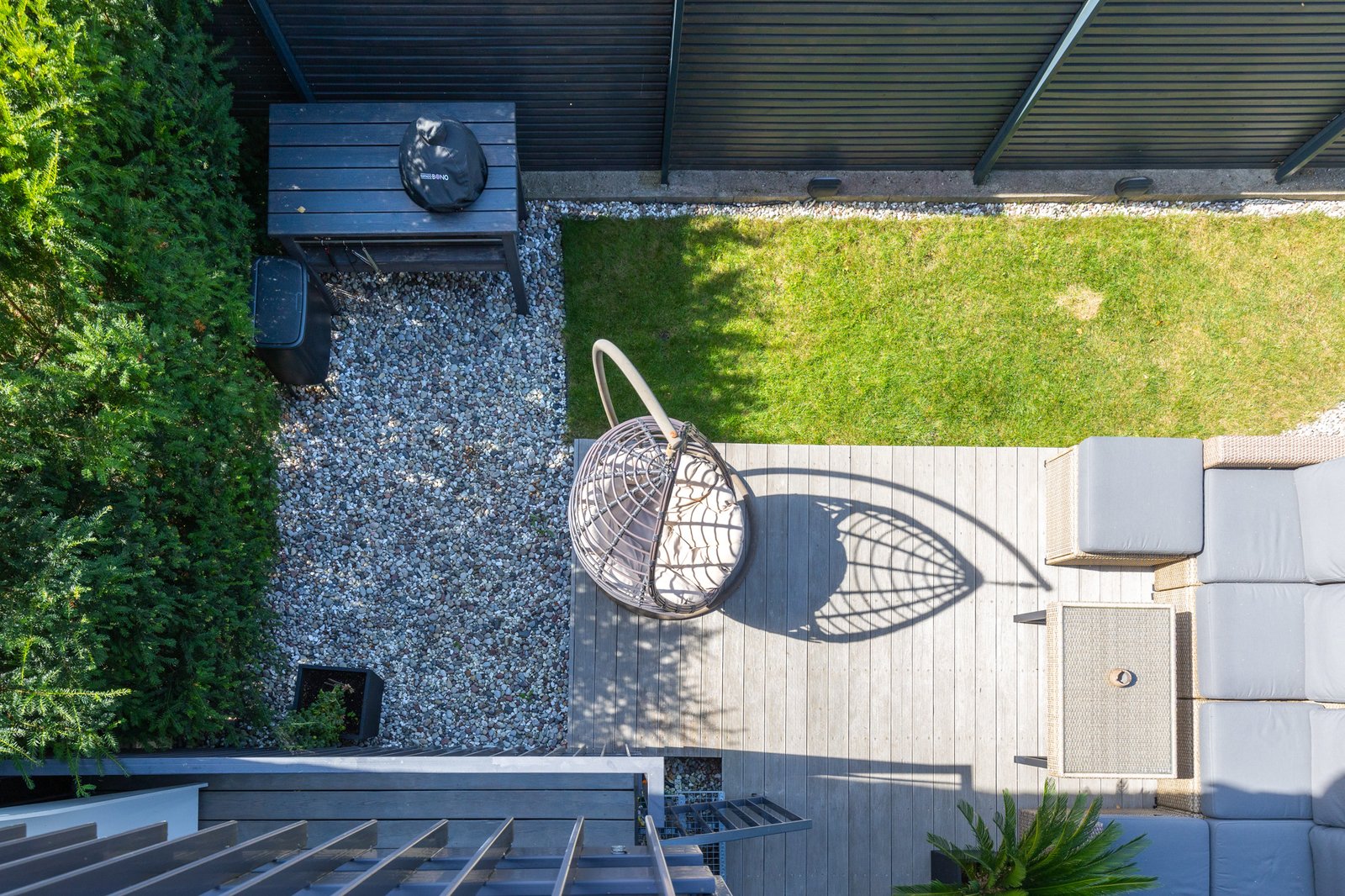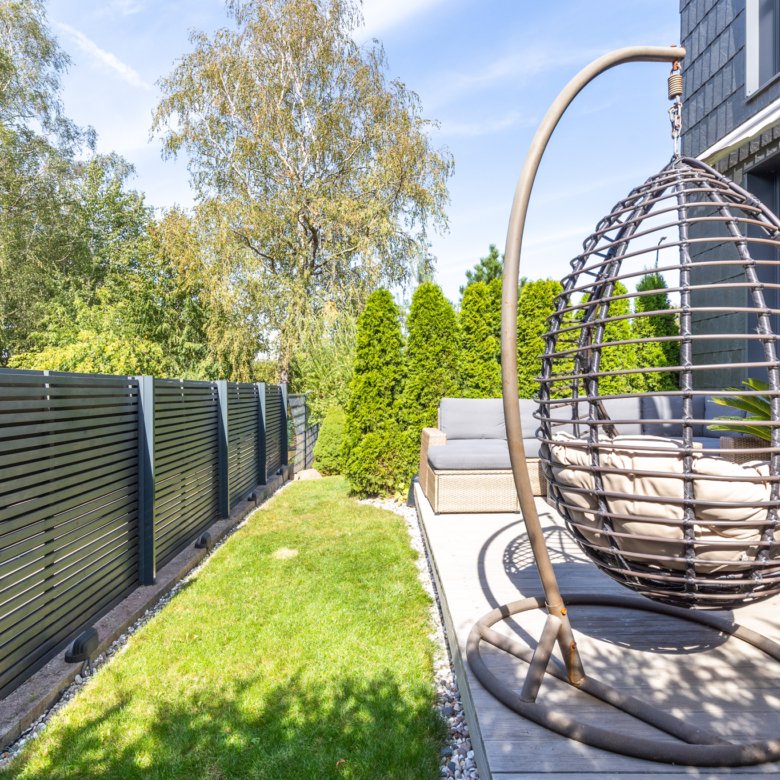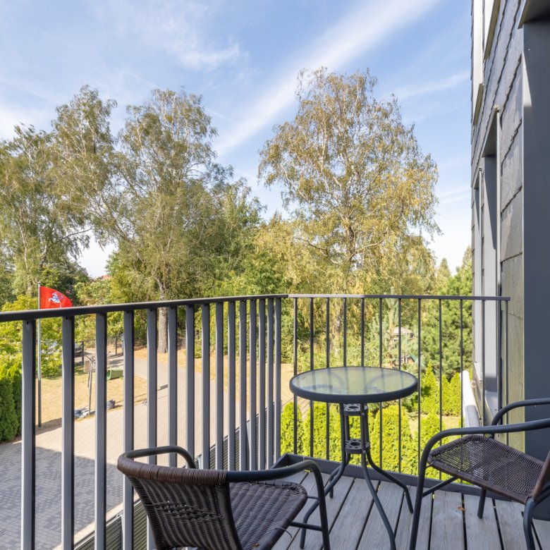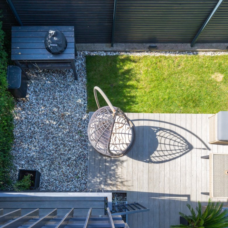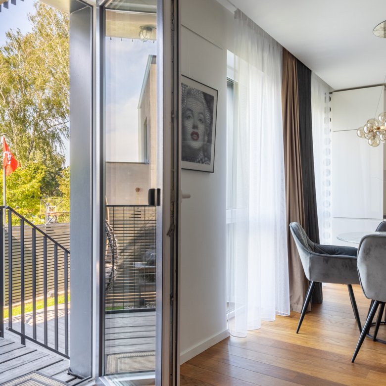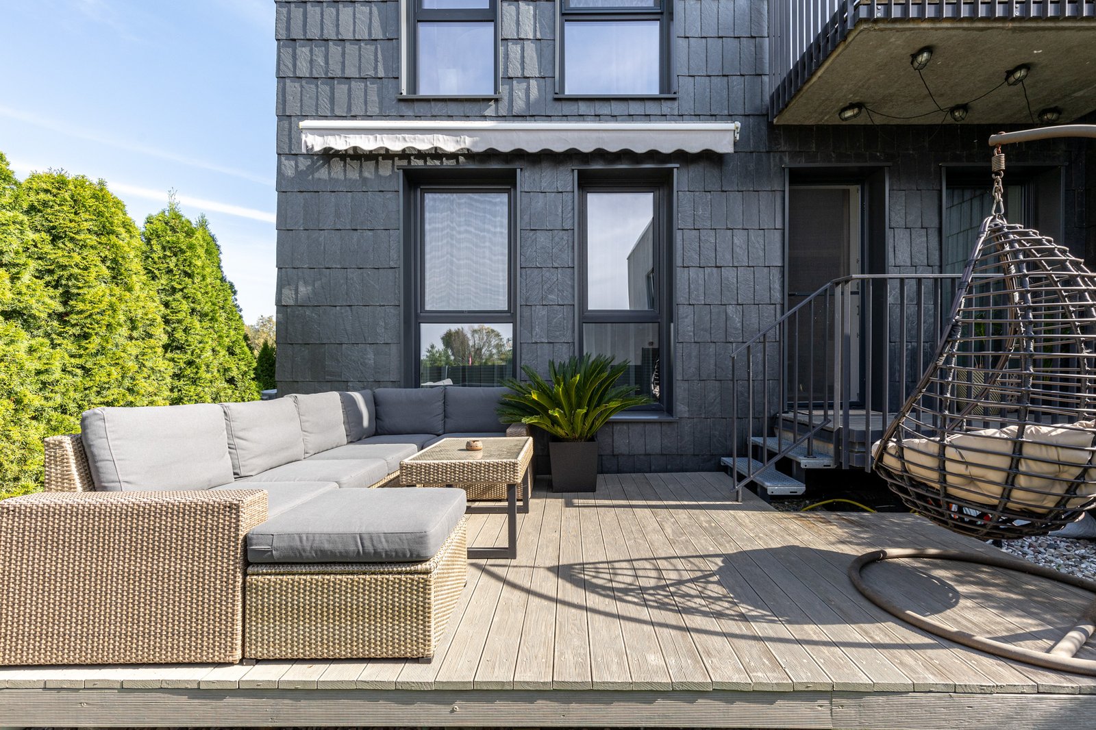 Iš svetainės – tiesioginis išėjimas į kampinę terasą su baldais, tvora ir tujomis, užtikrinančiomis privatumą.