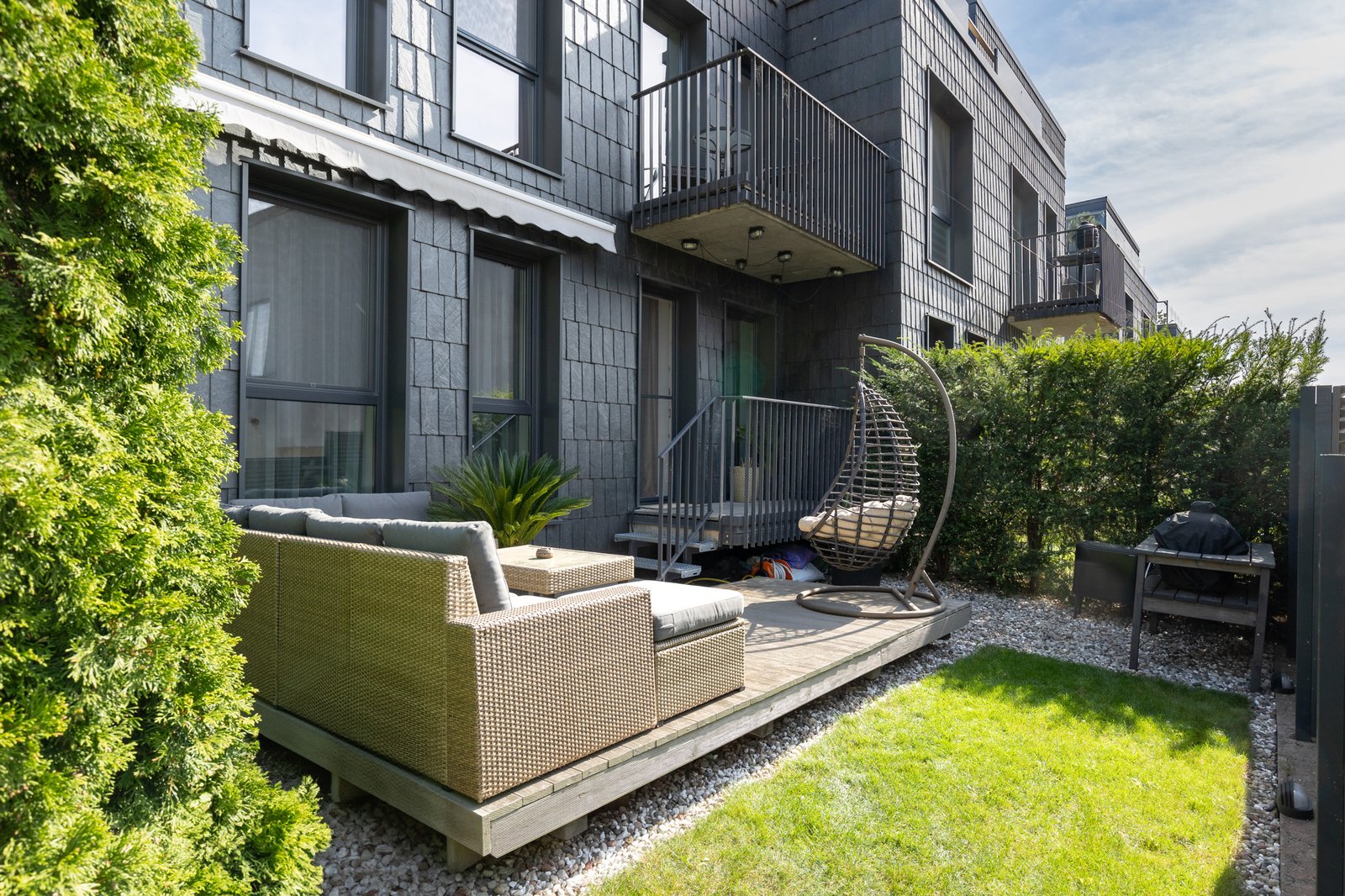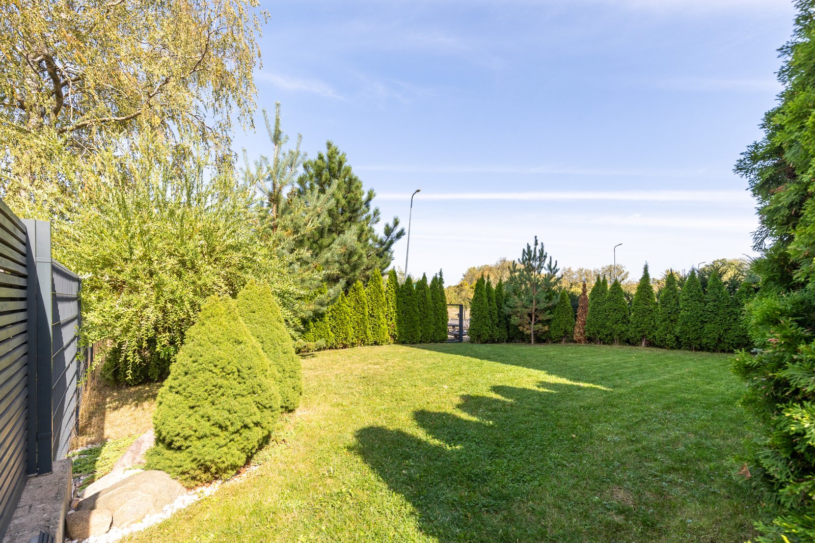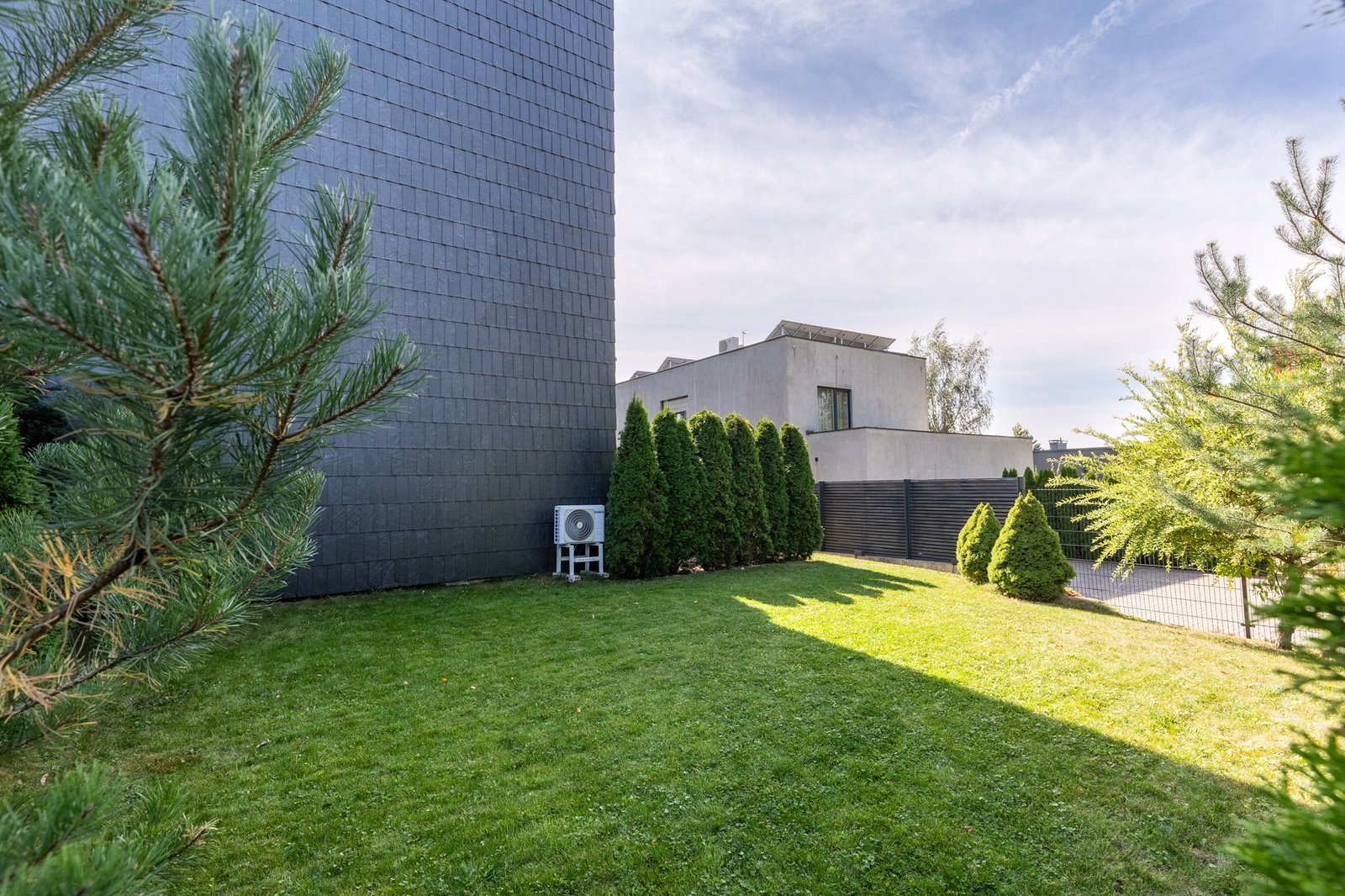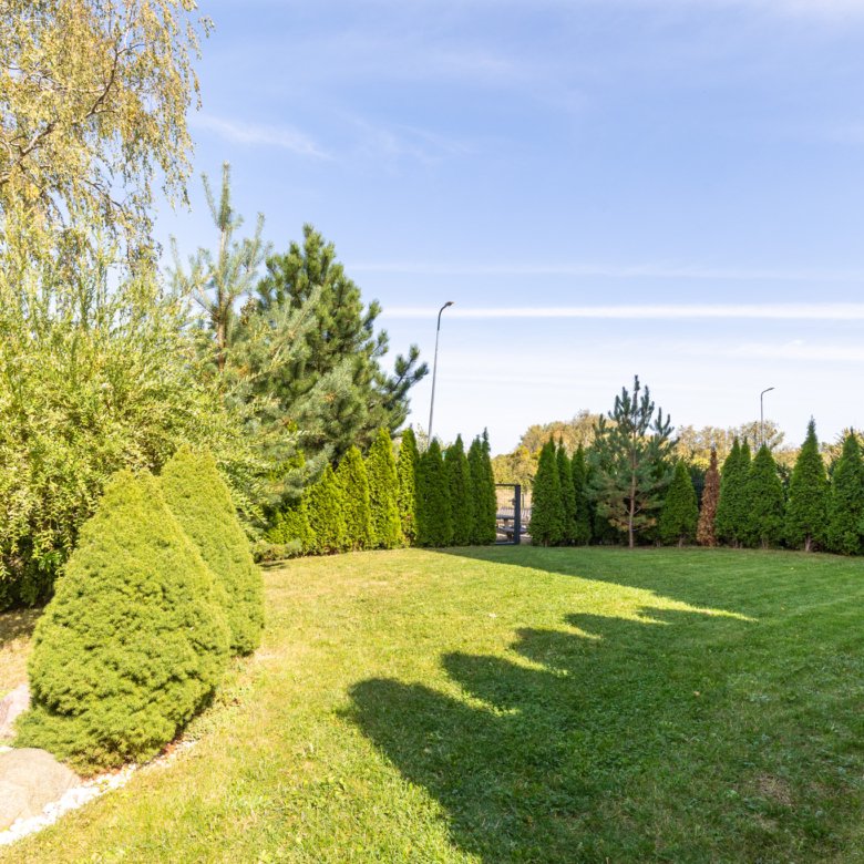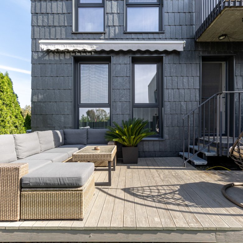 Iš svetainės – tiesioginis išėjimas į kampinę terasą su baldais, tvora ir tujomis, užtikrinančiomis privatumą.