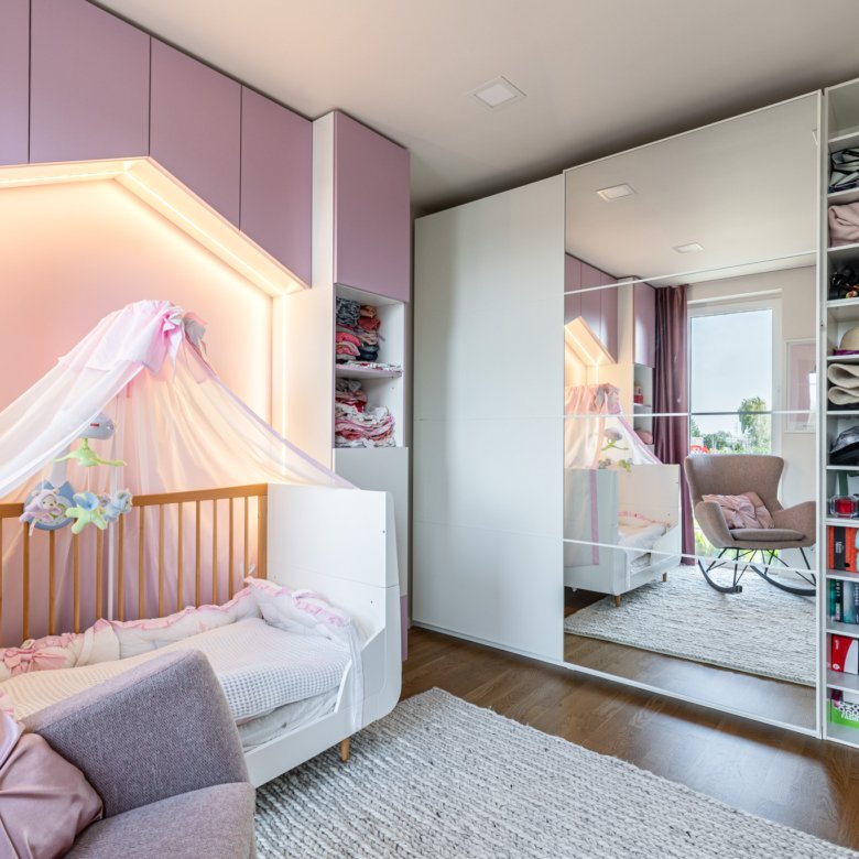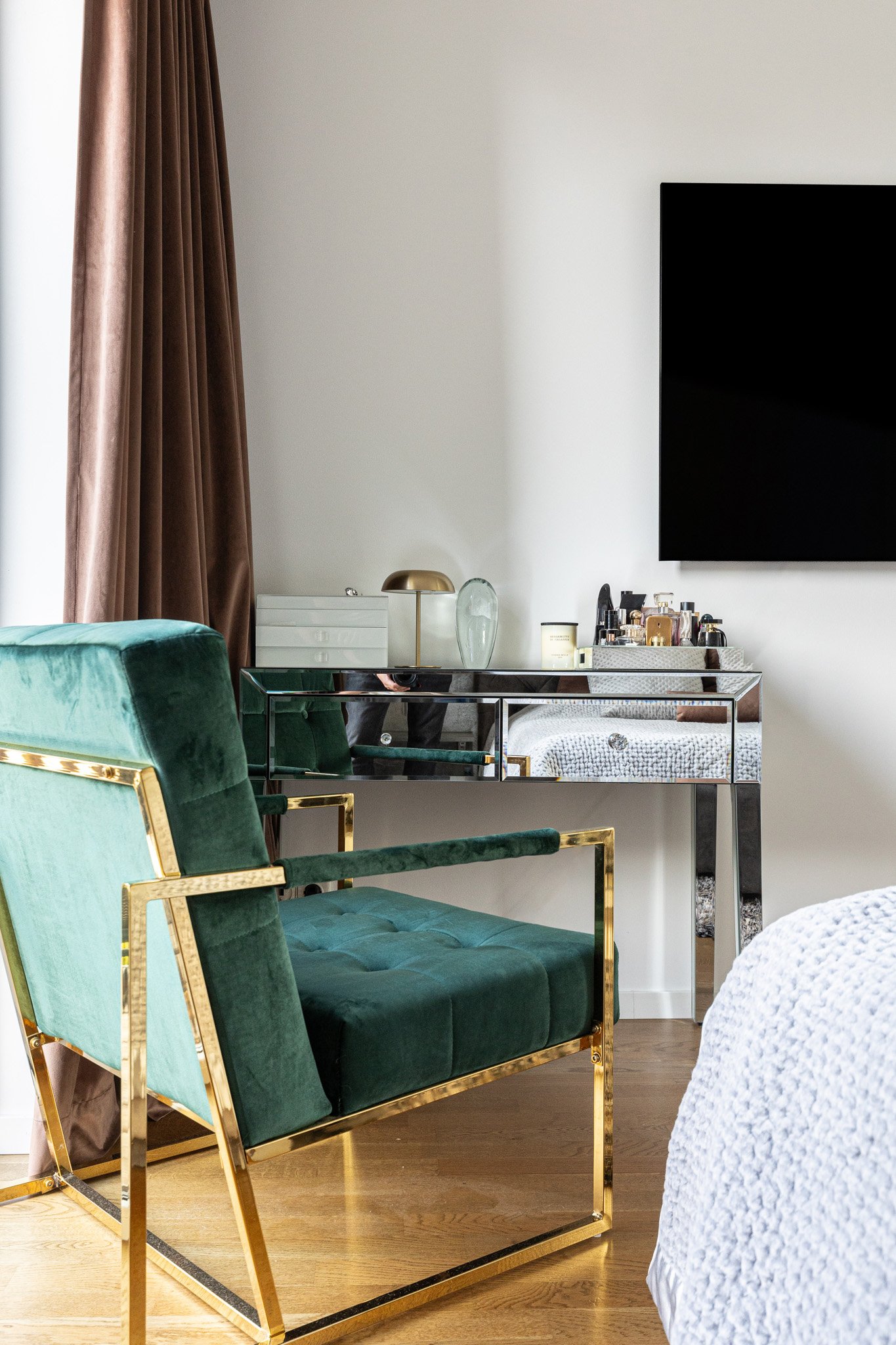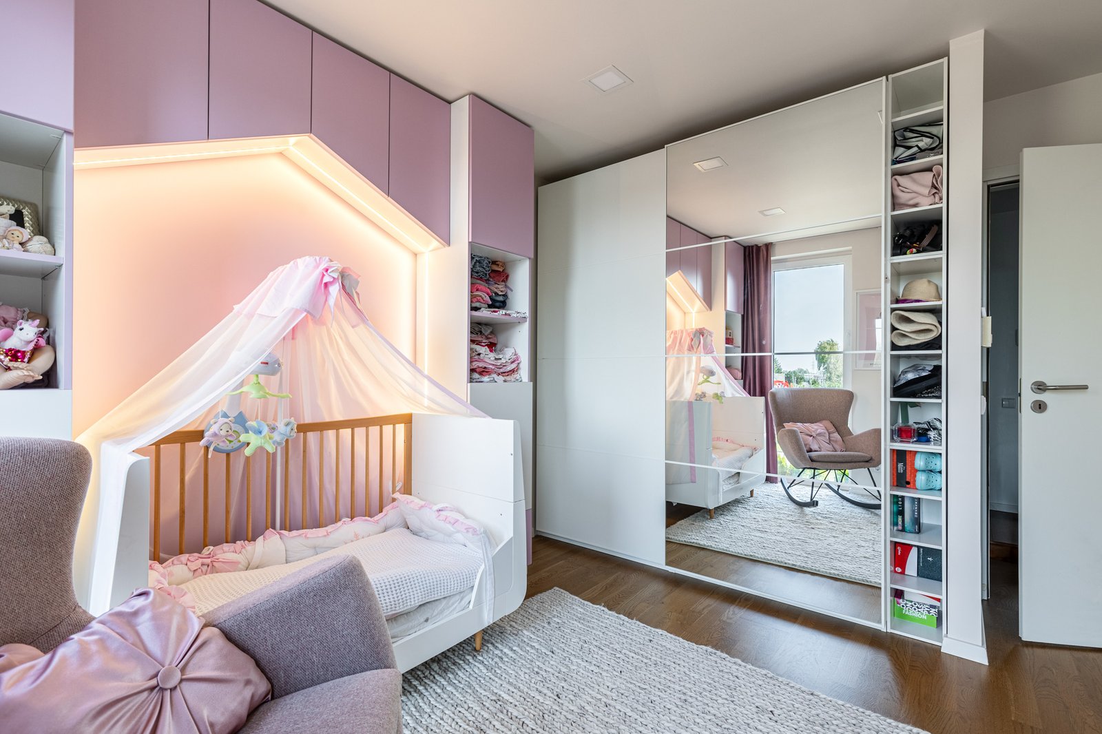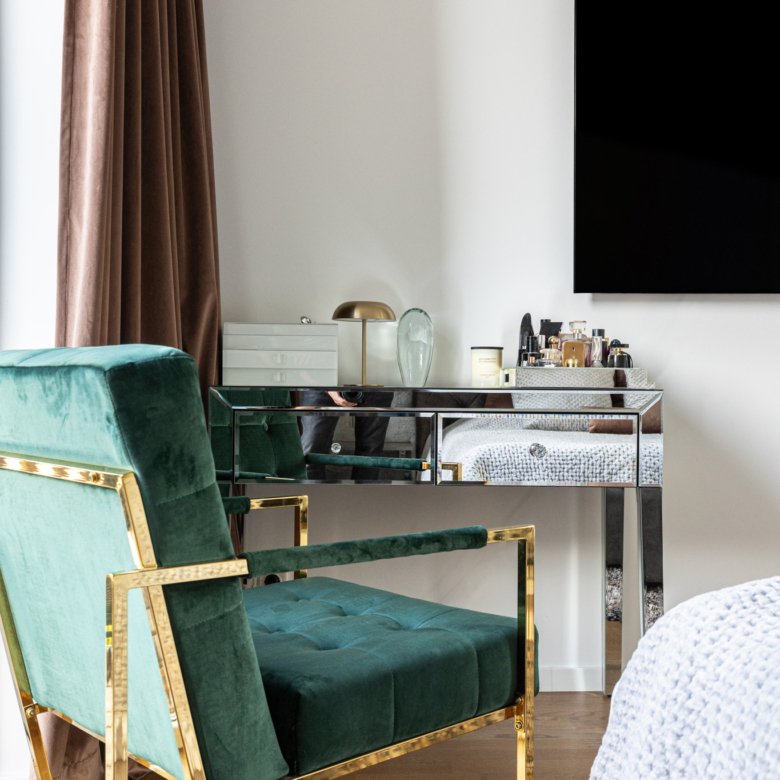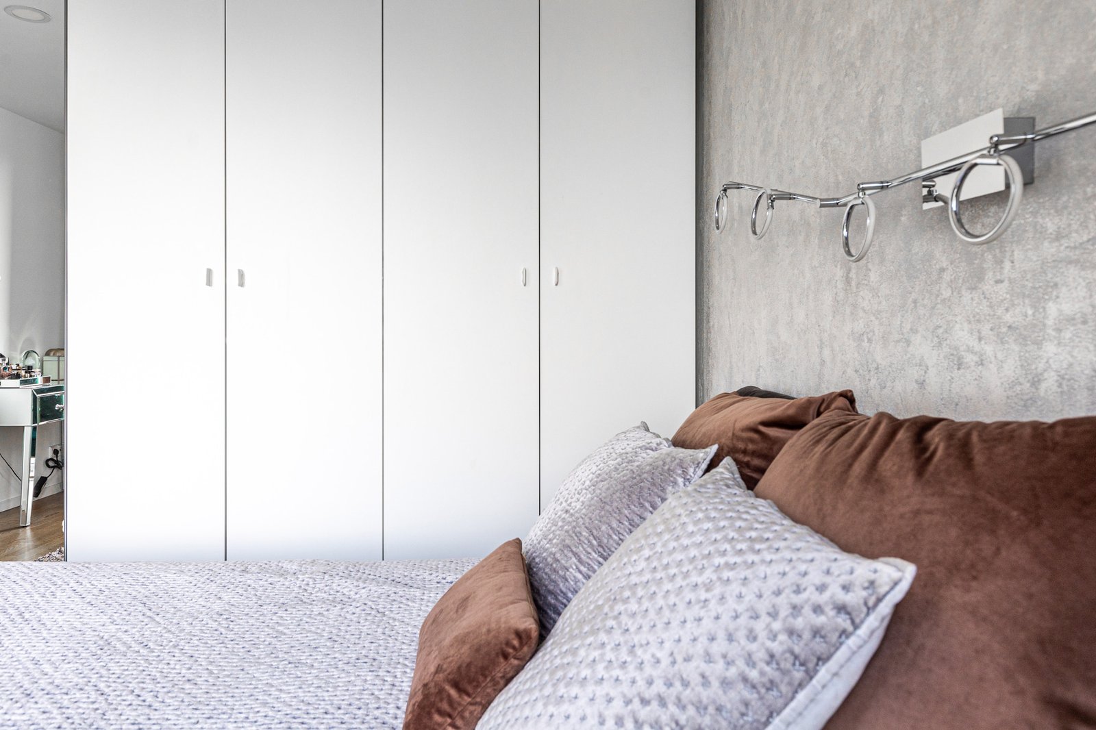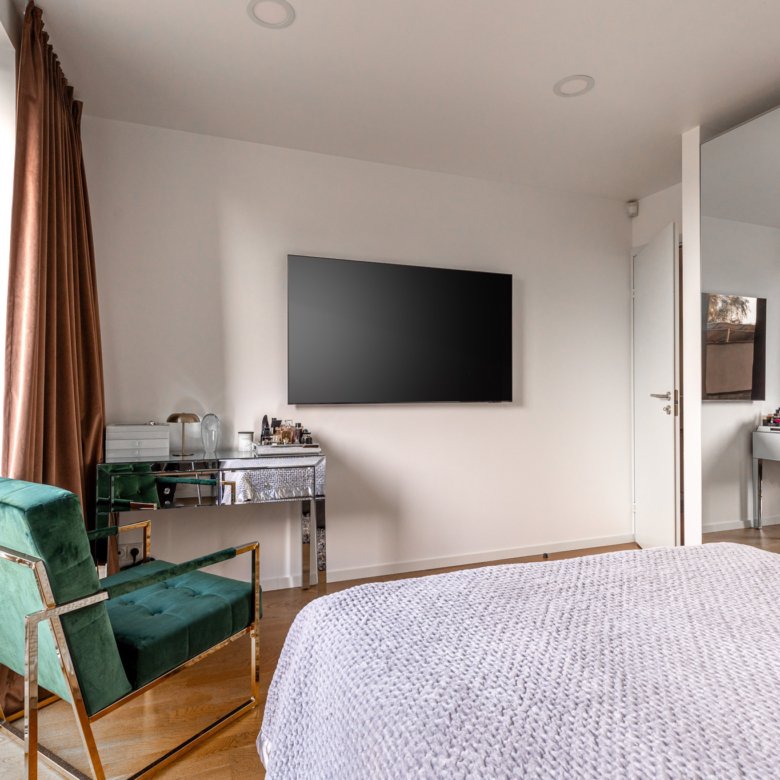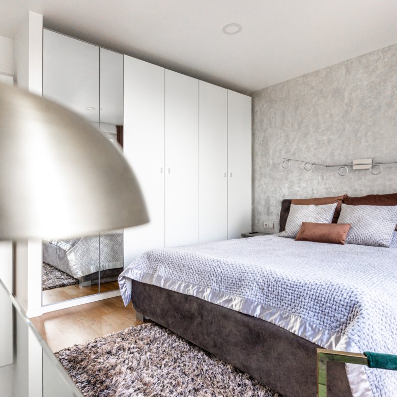 Pagrindinis miegamasis – su didžiule sienine spinta, kosmetiniu staliuku ir išėjimu į balkoną.