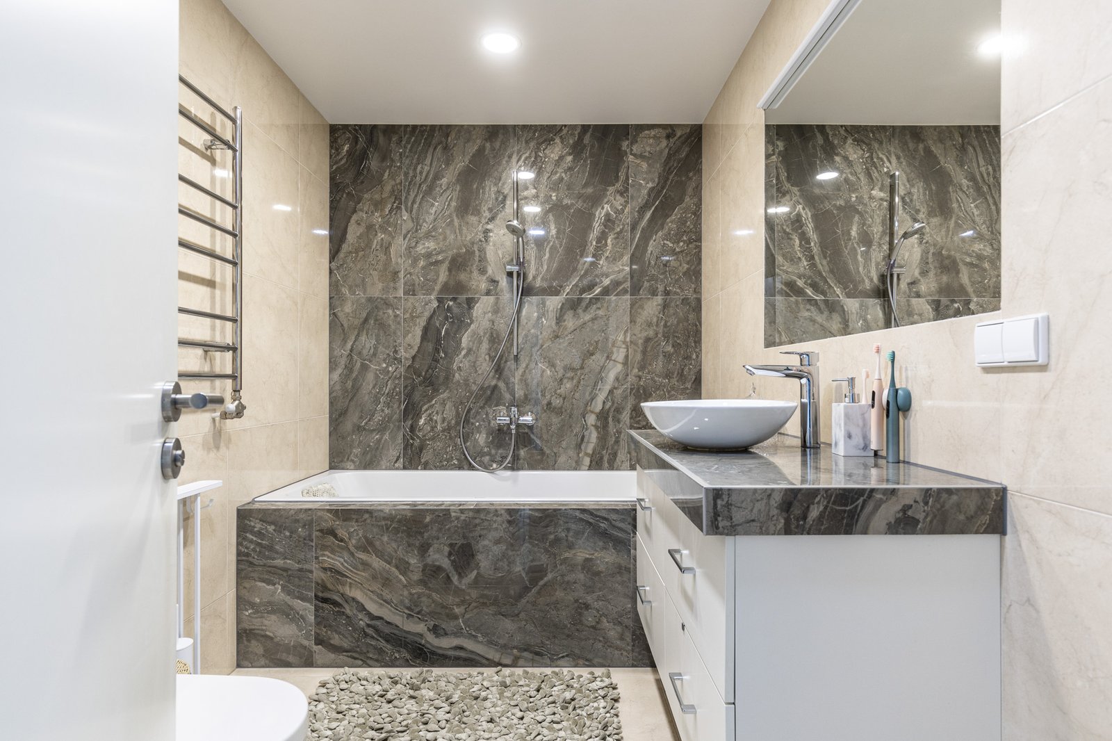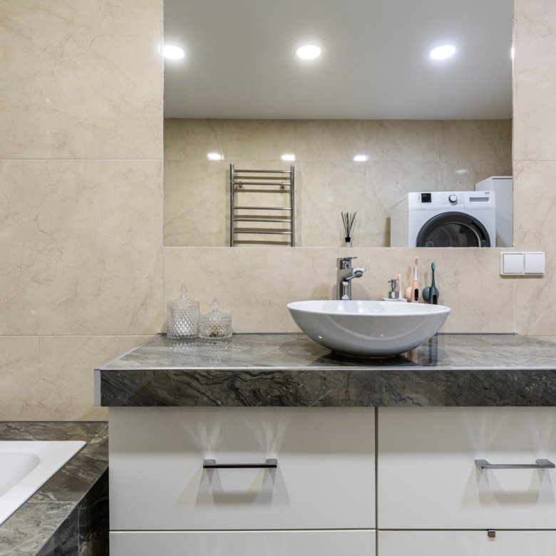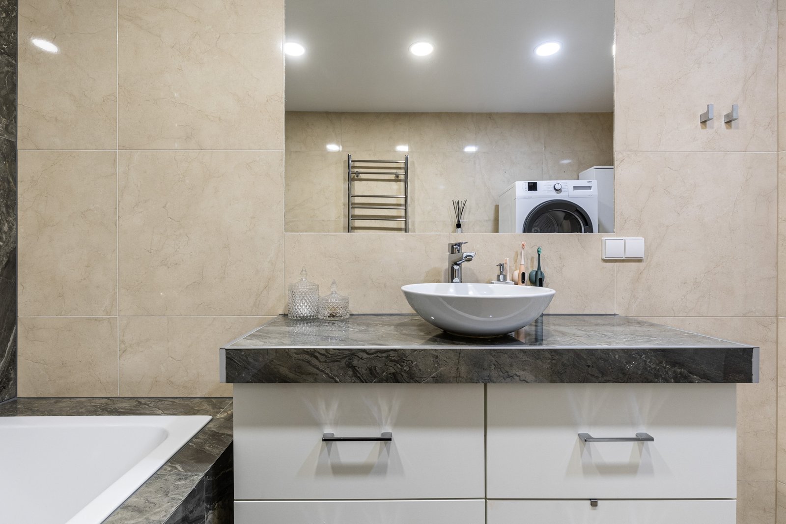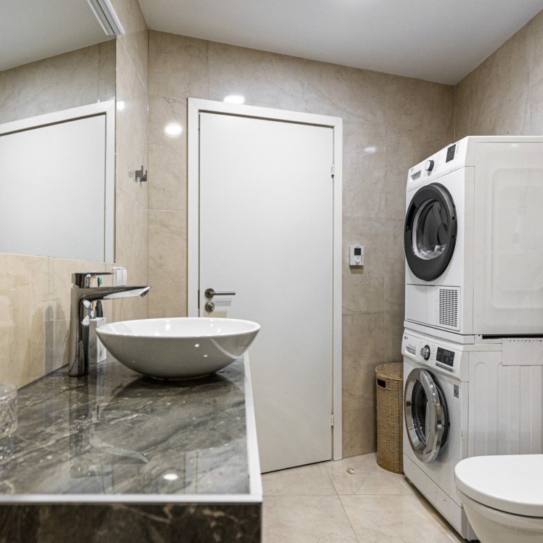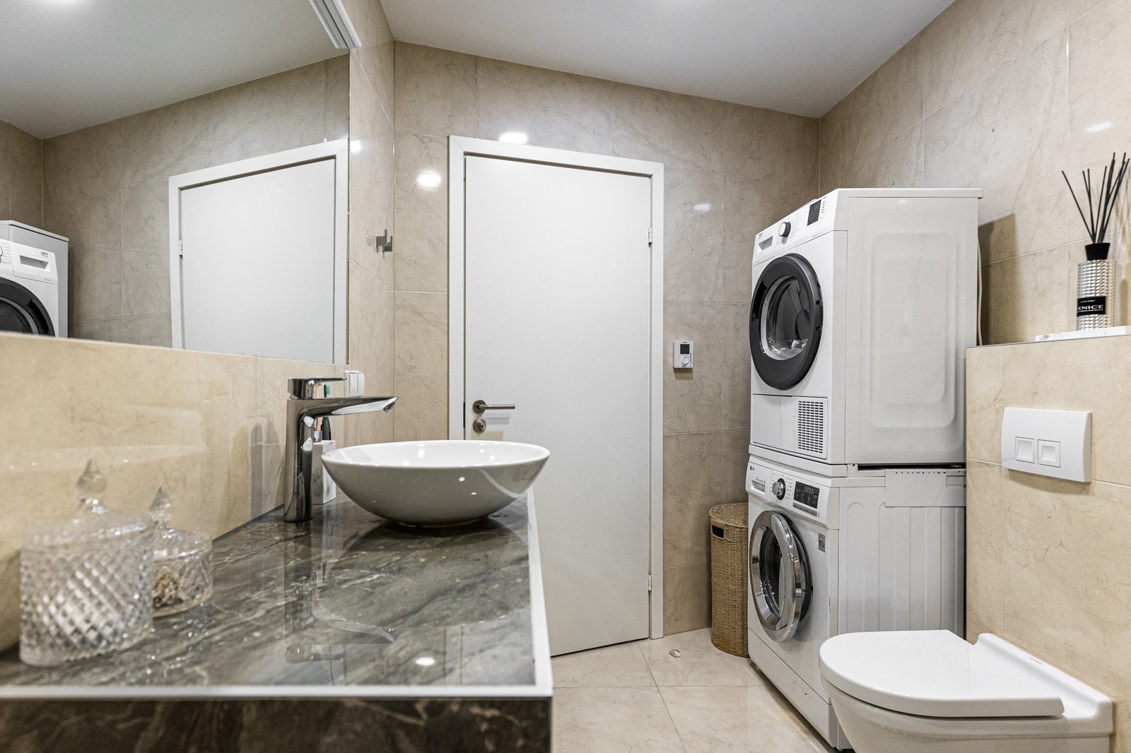 Vonios kambaryje – vonia, skalbyklė ir džiovyklė.